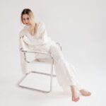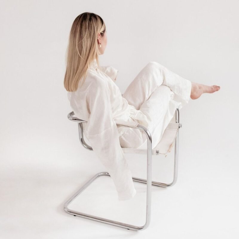 Crafted from a luxurious blend of 55% linen and 45% silk, this two-piece set is where softness meets structure — a dream pairing of natural texture and subtle sheen. The wide-leg trousers offer fluid movement and elegant shape, while the oversized blouse brings softness, confidence, and quiet power in one timeless cut.
